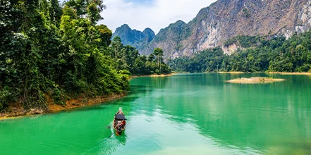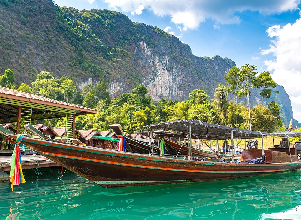 Der Tag beginnt damit, dass Sie von Ihrem Hotel abgeholt werden – danach erwartet Sie eine landschaftlich reizvolle Fahrt zum Ratchaprabha-Damm. Von hier aus fahren Sie in einem traditionellen Longtail-Boot durch die atemberaubende Landschaft des Sees. Die Tour geht weiter mit einer kurzen Dschungelwanderung, bei der Sie die vielfältige Tierwelt und Flora Thailands erleben können, bevor Sie an Bord eines Bambusfloßes gehen, um den See zu überqueren und eine Höhle mit beeindruckenden Felsformationen zu erkunden.