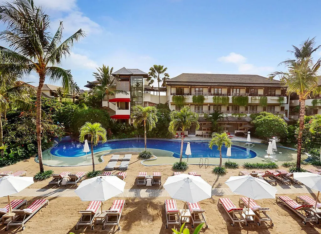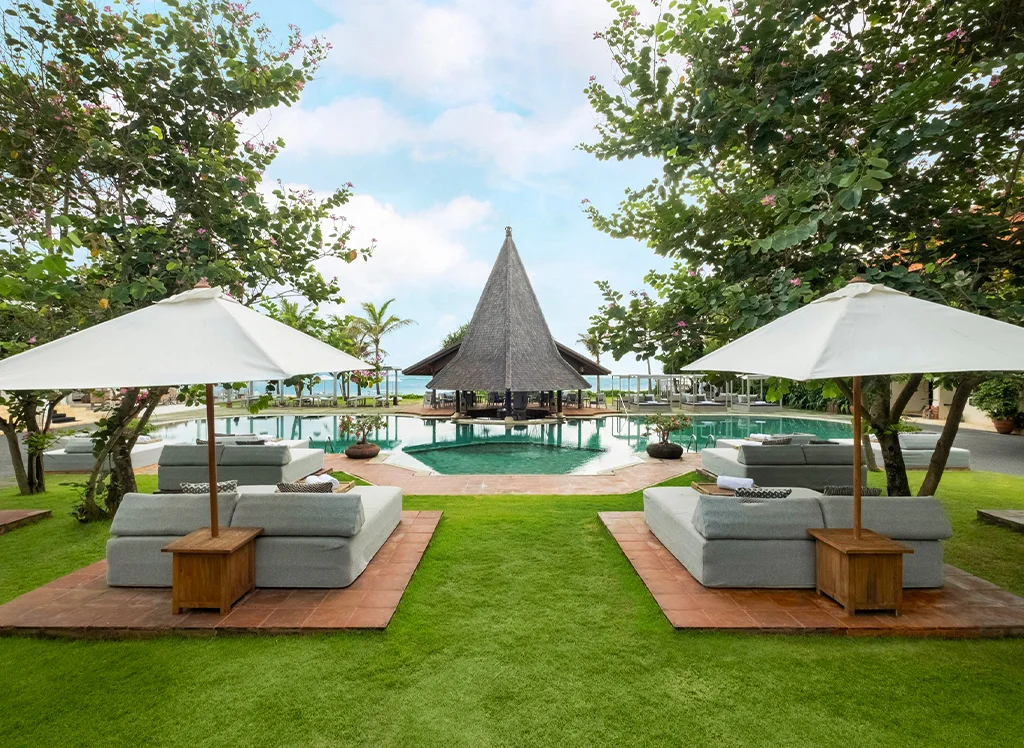 Das 4-Sterne-Resort ist von Hunderten von Palmen umgeben und liegt direkt am kilometerlangen, unberührten Sandstrand von Pekutatan.