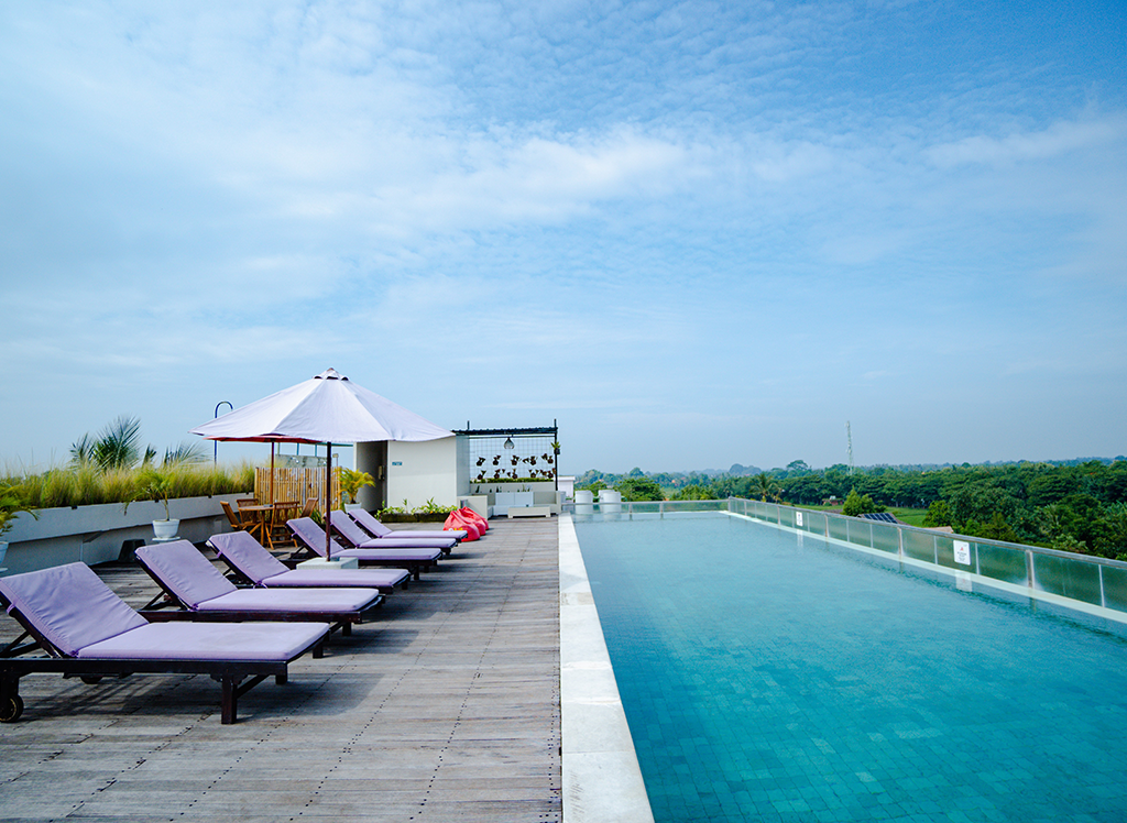 Die Dachterrasse des Hotels bietet einen atemberaubenden Blick auf das pulsierende Seminyak, wo Sie entweder einen romantischen Abend oder eine gemütliche Zeit mit der Familie verbringen können.