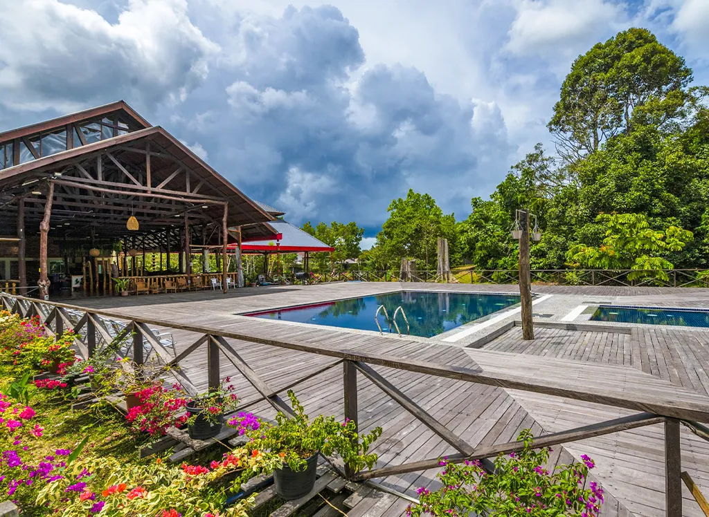 Diese einzigartige Lage mitten im Regenwald bietet Ihnen die Möglichkeit, ein authentisches Naturerlebnis zu genießen, bei dem Sie die Geräusche des Dschungels hören und die reiche Tierwelt, darunter Nasenaffen, Orang-Utans und eine Vielzahl von Vogelarten, direkt von der Lodge aus beobachten können.