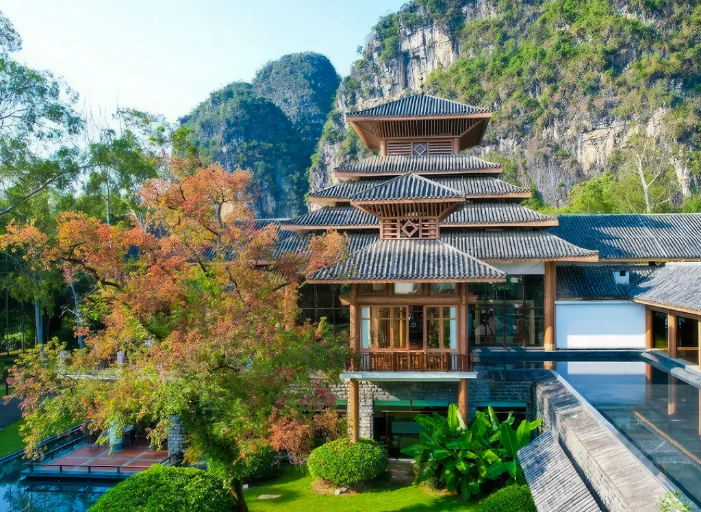 Bo naturschön im Yangshuo Riverside Resort in der Nähe der Stadt und des Li-Flusses. Erleben Sie wunderschöne Landschaften, lokale Gerichte und komfortable Zimmer mit modernen Annehmlichkeiten.
