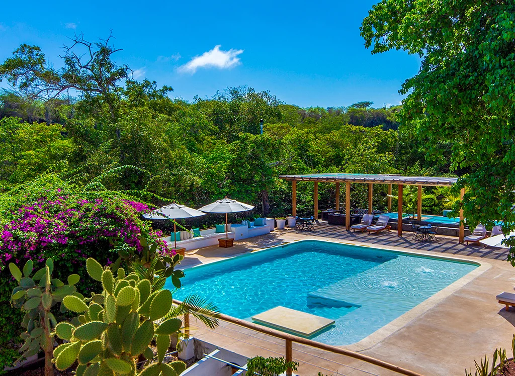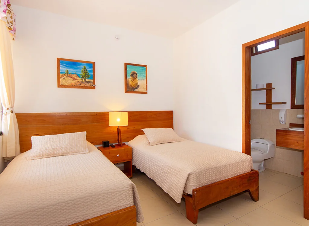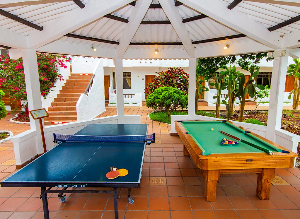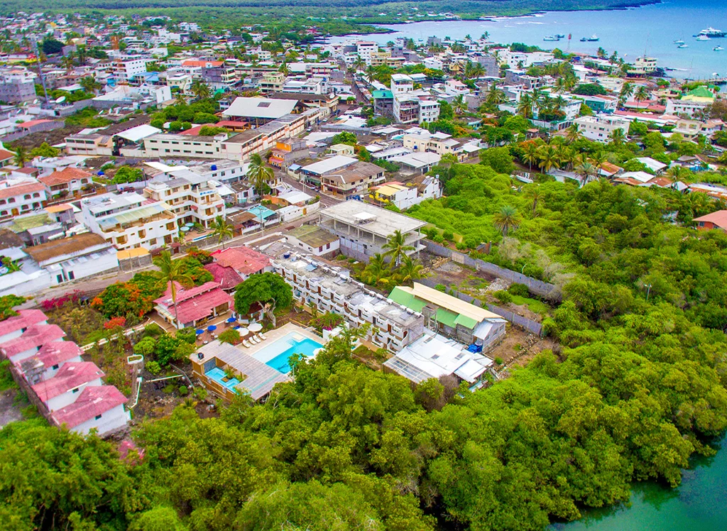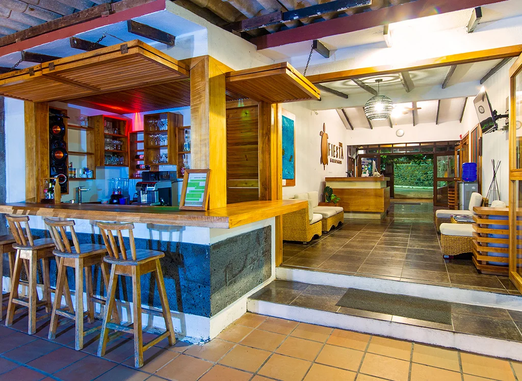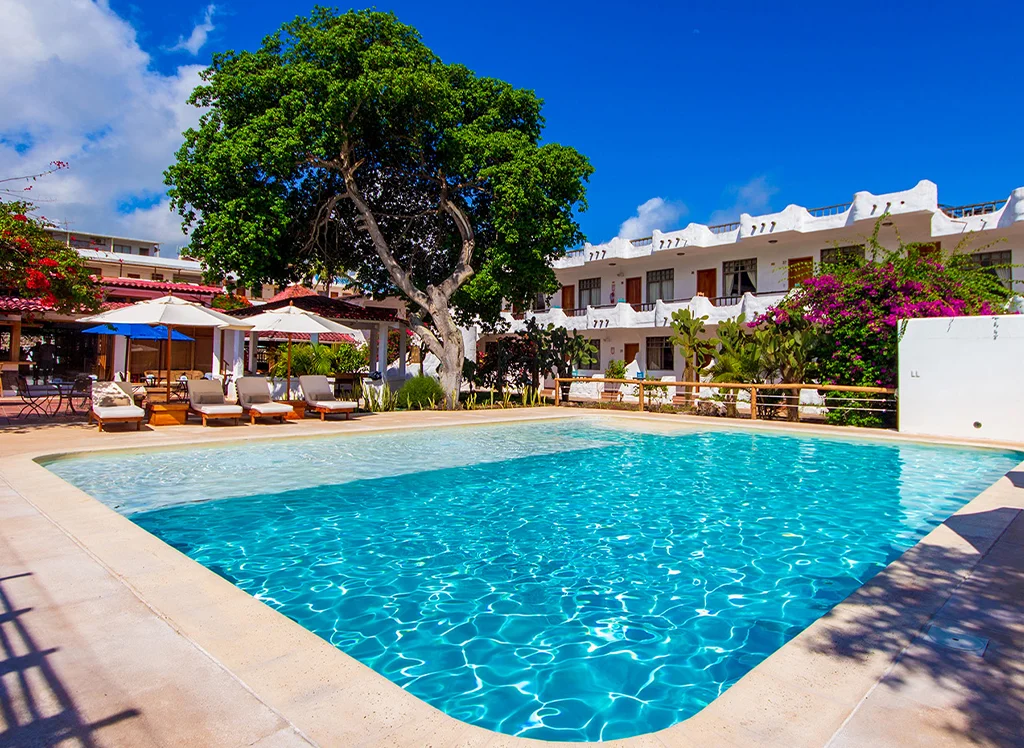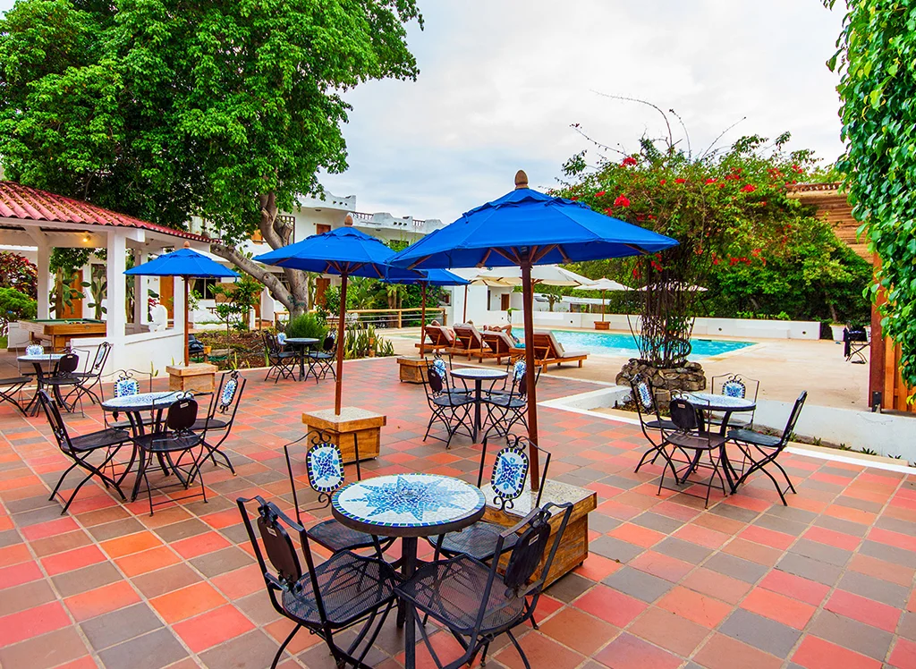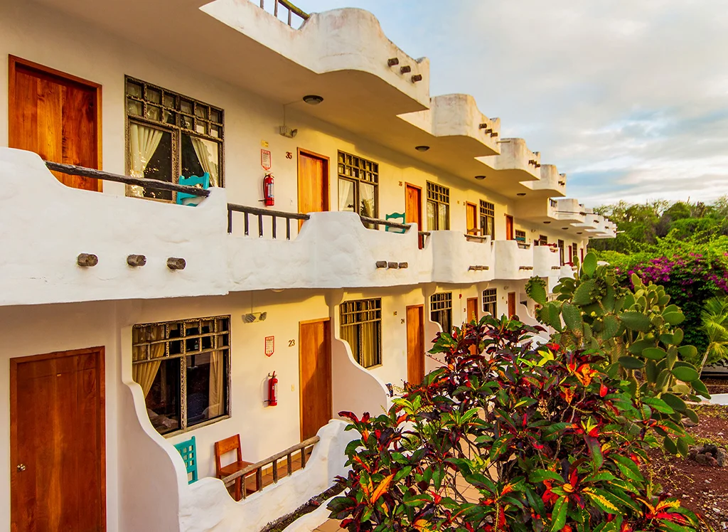 Wohnen Sie zentral auf Santa Cruz Island im Hotel Fiesta: komfortable Zimmer, Restaurants, Pool & Jacuzzi – perfekter Ausgangspunkt für Galápagos-Erlebnisse.