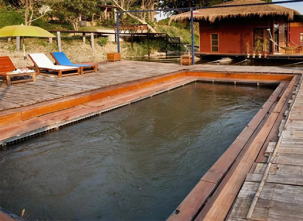 Die schwimmenden Bungalows des Boutique Raft Resort sind aus Hartholz gefertigt und mit vor Ort hergestellten Möbeln eingerichtet, die sich harmonisch in die umgebende Natur einfügen.