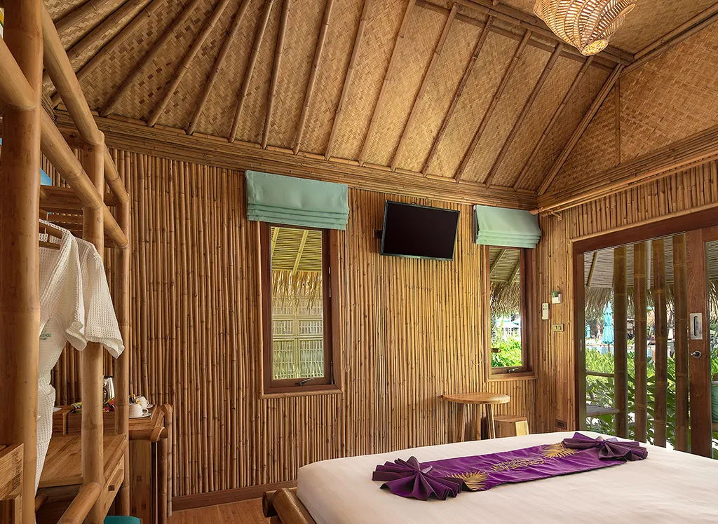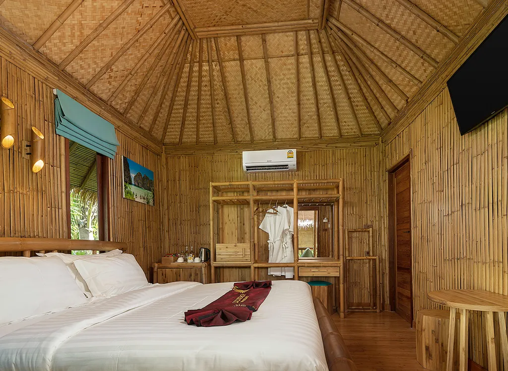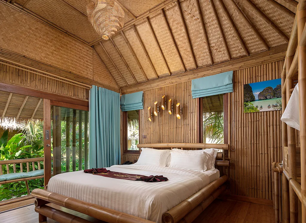 Im Phi Phi CoCo Beach Resort, das 2018 erbaut wurde, wohnen Sie in einem schönen strohgedeckten Bambus-Bungalow mit Doppel- oder Einzelbetten, Kleiderschrank und einem schönen Bad mit Dusche. Außerdem gibt es eine Minibar, einen Safe, einen Fernseher und eine Klimaanlage. Alle Bungalows haben außerdem eine schöne Terrasse oder einen Balkon mit Blick auf den üppigen Garten. Es ist möglich, ein Upgrade auf Meerblick zu bekommen.
