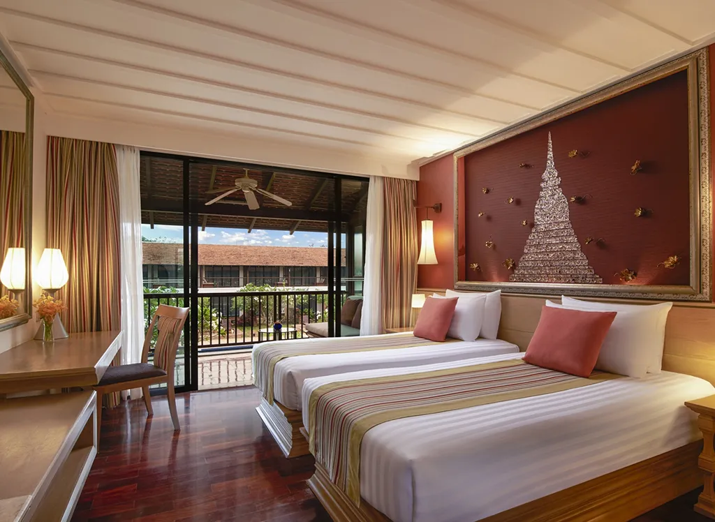 Alle Zimmer im Sukhothai Heritage Resort sind geräumig und hübsch eingerichtet und verfügen über bequeme Betten, ein eigenes Bad und einen Balkon, von dem aus Sie den Blick auf die üppigen Gärten oder den Swimmingpool genießen können. Die Zimmer verfügen auch über einen Fernseher und Wi-Fi.