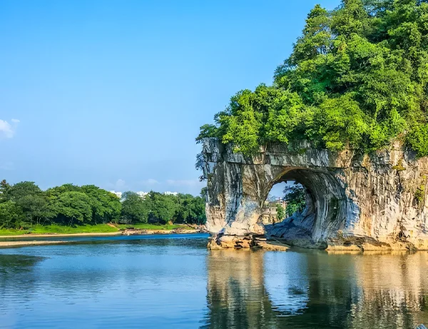 Danach geht die Reise weiter zum malerischen Elephant Trunk Hill, der in seiner Form an einen Elefanten erinnert, der aus dem Fluss trinkt – ein klassisches Symbol für Guilin.